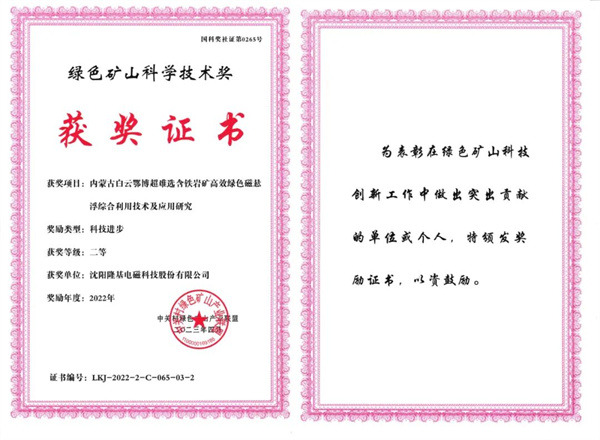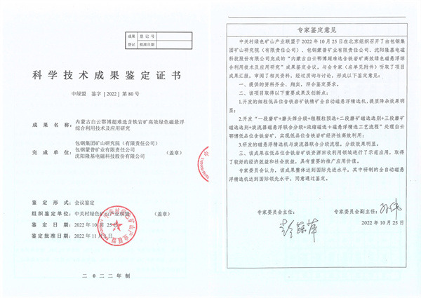 由沈陽隆基電磁科技股份有限公司、包鋼集團(tuán)礦山研究院(有限責(zé)任公司)、包鋼蒙普礦業(yè)有限責(zé)任公司共同完成的“內(nèi)蒙古白云鄂博超難選含鐵巖礦高效綠色磁懸浮綜合利用技術(shù)及應(yīng)用研究”通過“中綠盟”組織的科學(xué)技術(shù)成果鑒定,被認(rèn)定為國際先進(jìn)水平。