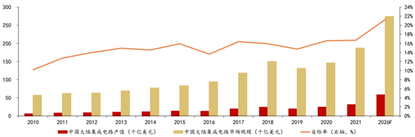 2021年中國大陸集成電路市場規模1870億美元,IC Insights預計2026年市場規模將達到2740億美元,復合增長率8%。