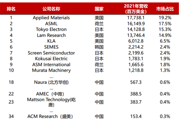 2021年全球半導體設備公司市場占比
