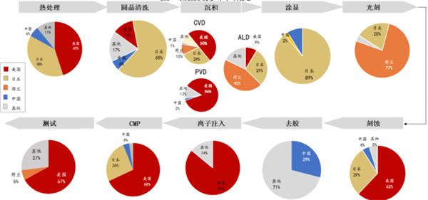 從具體環節來看:美國在薄膜沉積、離子注入、量測占據壟斷地位。應用材料在PVD、CMP、離子注入全球市占率分別為86%、68%、64%,泛林在刻蝕、電鍍設備占率分別為46%、78%,科磊在量測領域市占率54%。